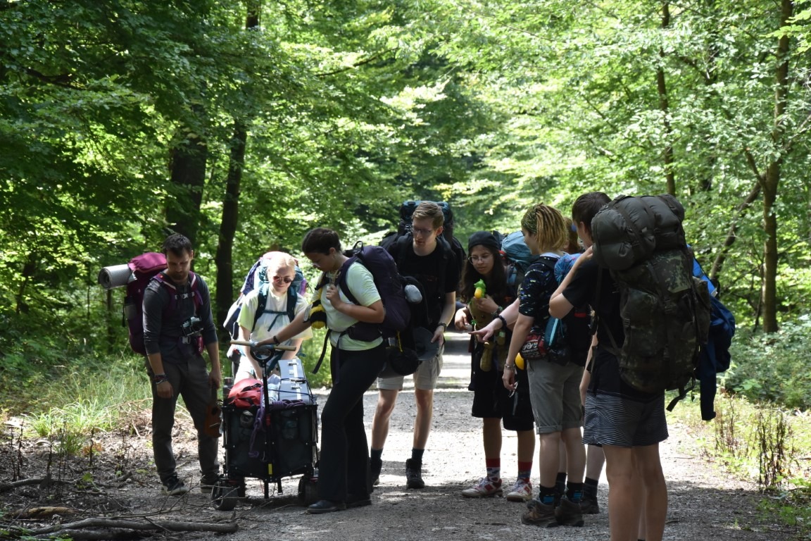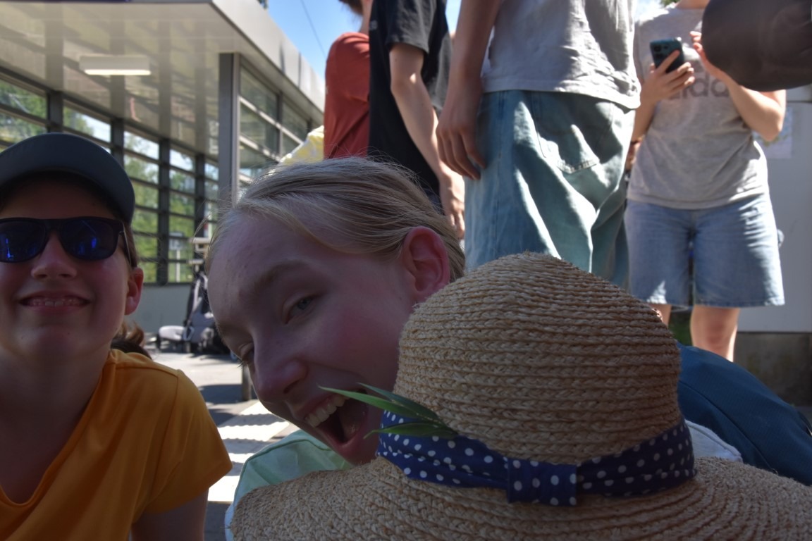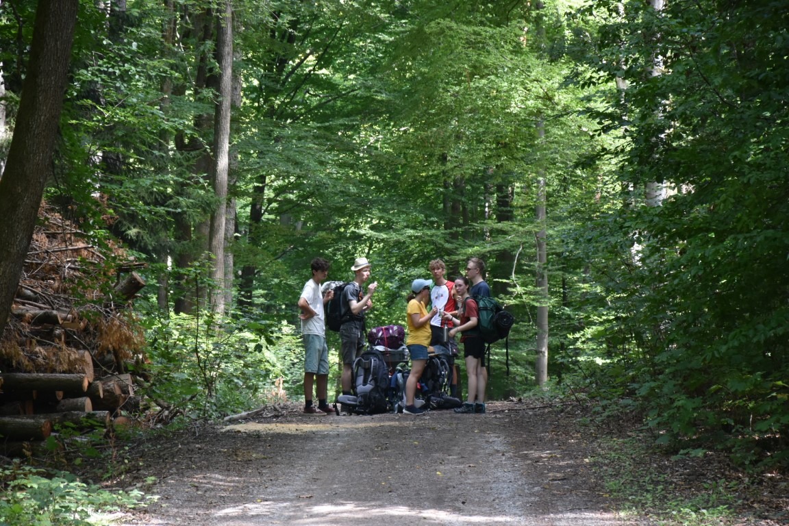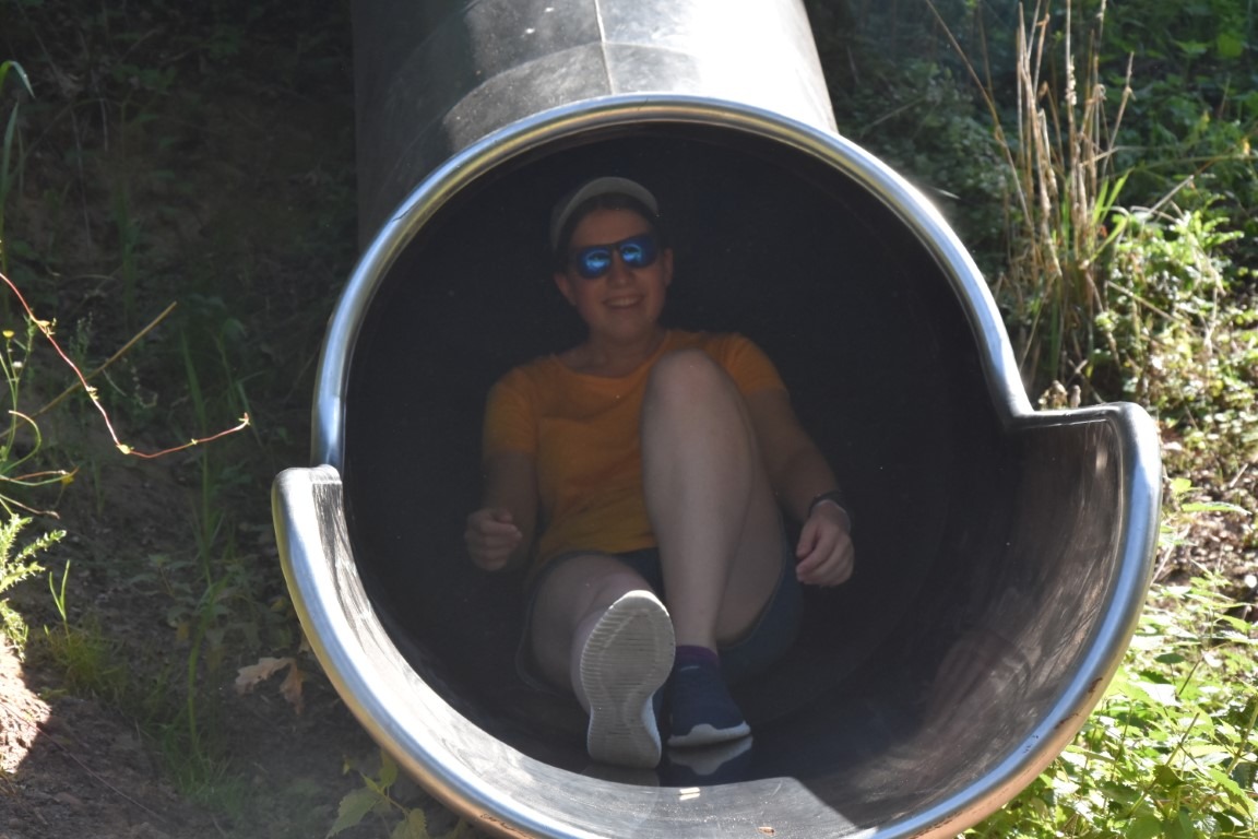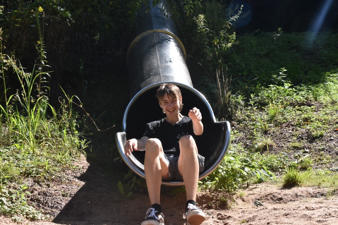 Diese Strecke hat’s in sich – aber das war kein Problem für uns! Eine Wasserpistole sorgte immer wieder für kleine Abkühlungen, als wir unterwegs an einer Rutsche vorbeikamen, wurde eine kleine Rutschpause eingelegt. Unser erstes Ziel war der Pausenplatz – ein wunderschöner Ort am Waldrand mit Schatten, guter Stimmung und frischen Apfelschnitzen (danke an ApfelAxel) zur Stärkung.