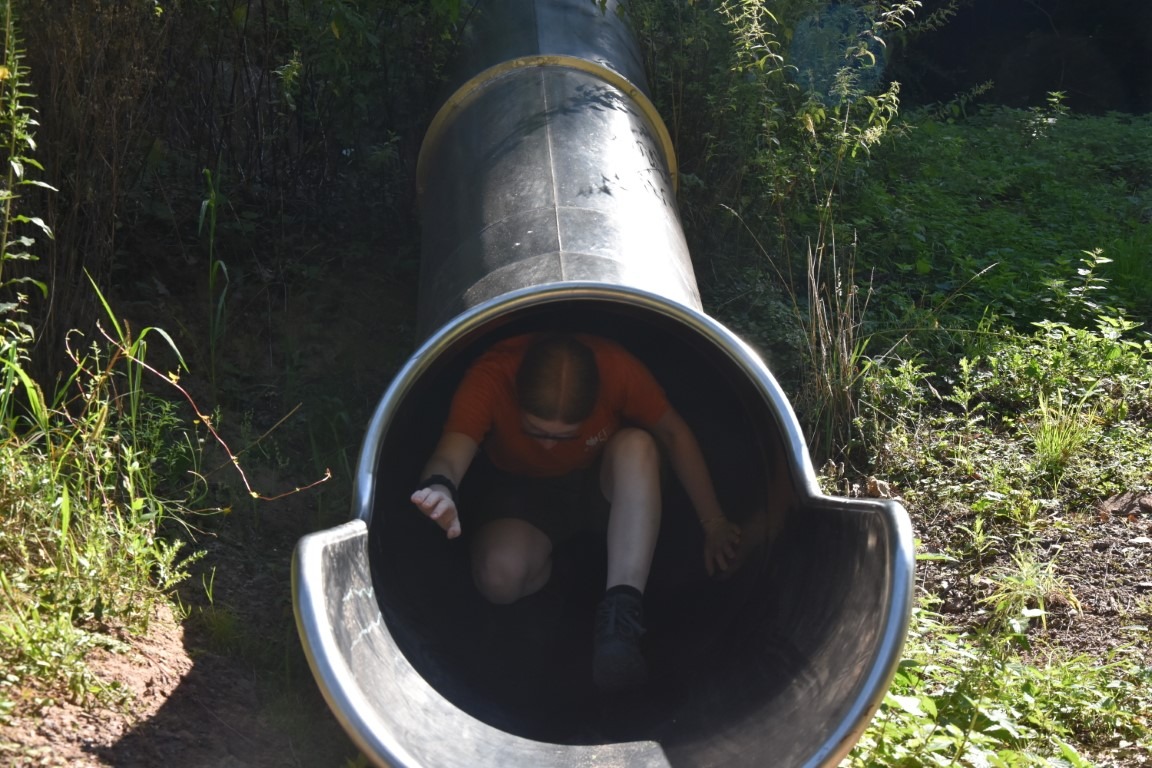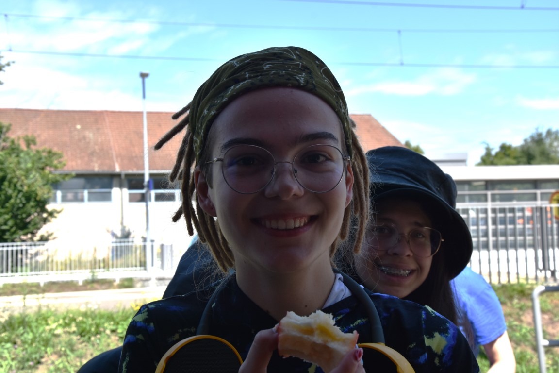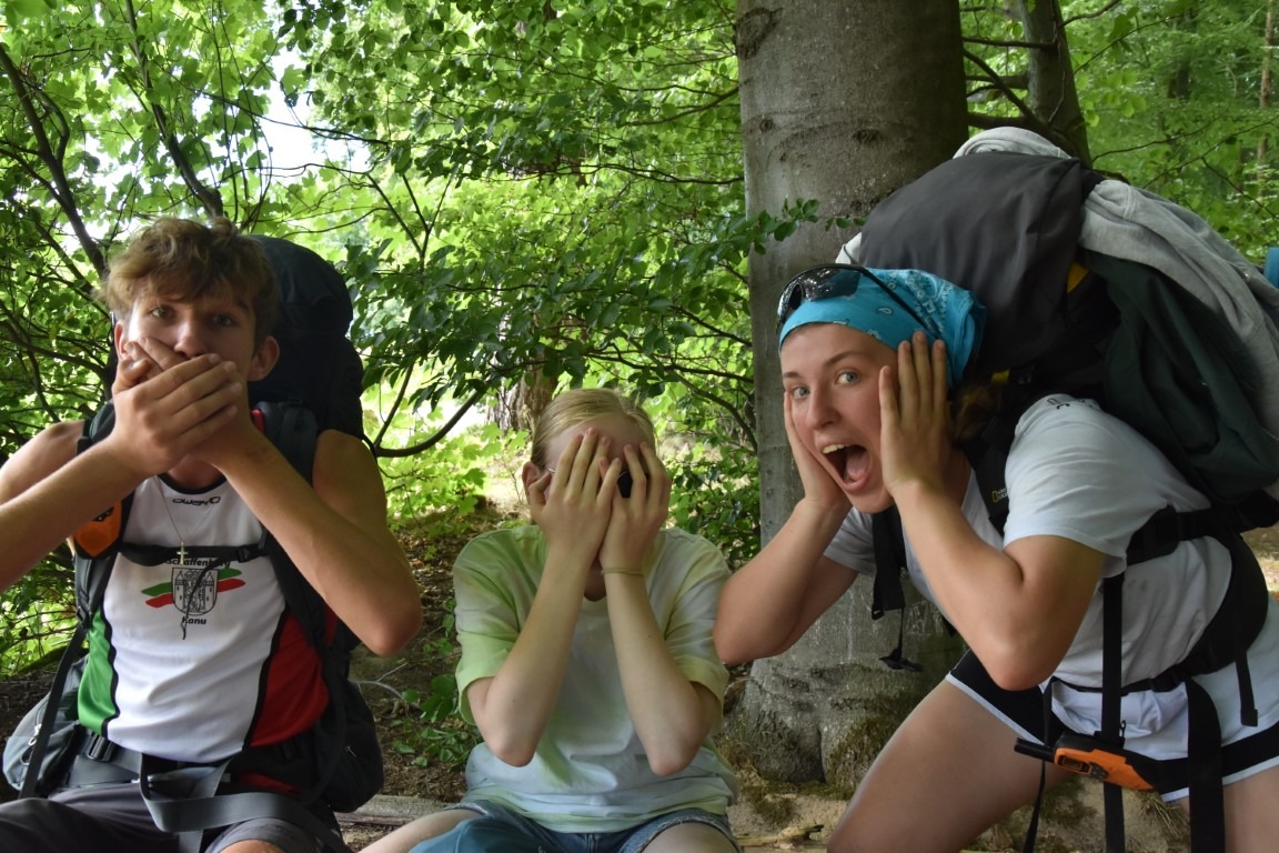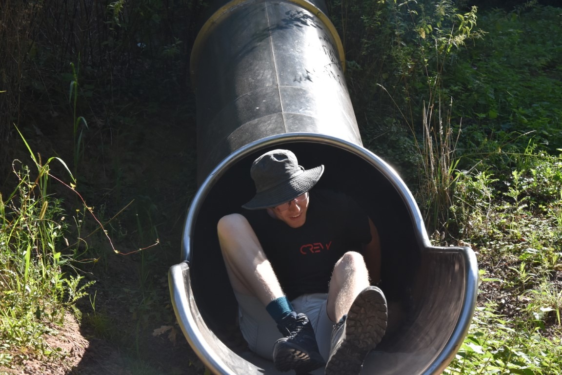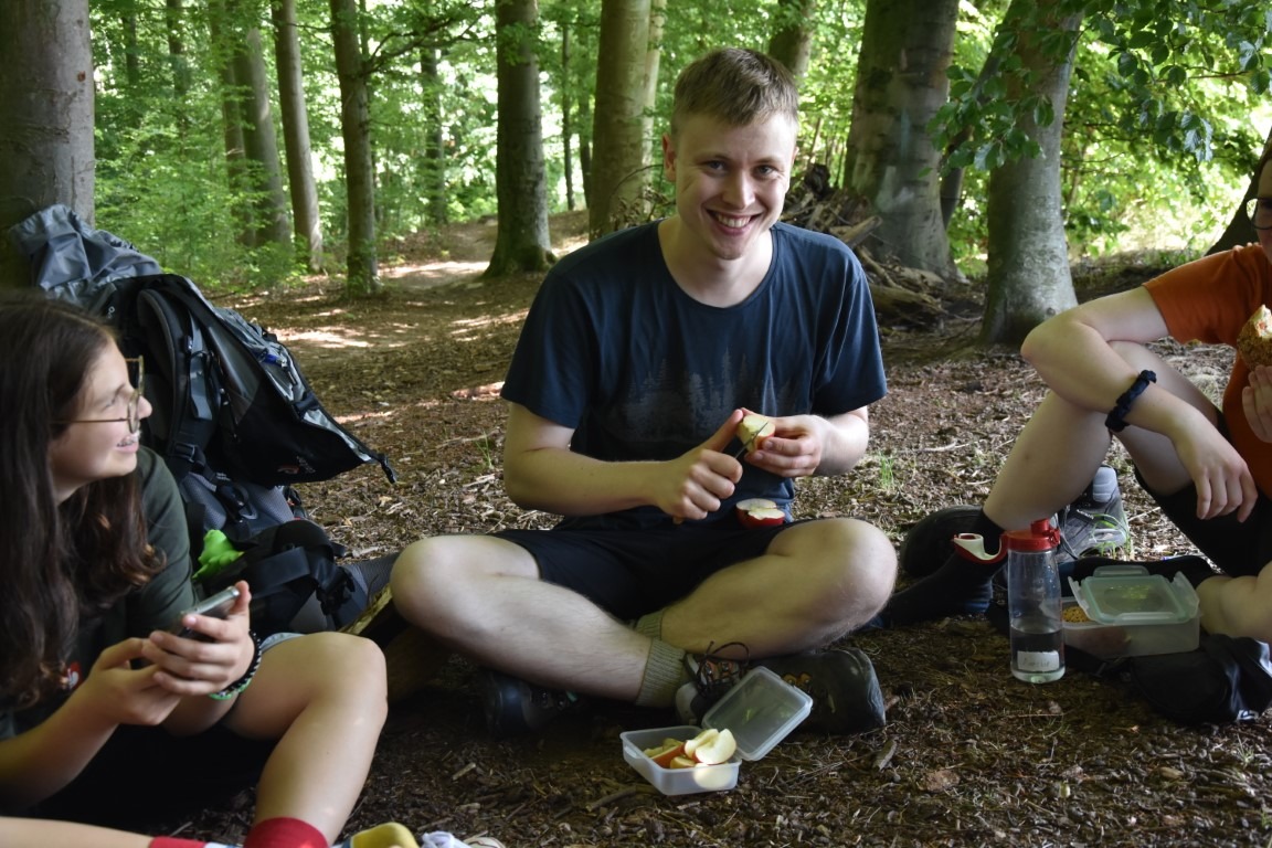 Diese Strecke hat’s in sich – aber das war kein Problem für uns! Eine Wasserpistole sorgte immer wieder für kleine Abkühlungen, als wir unterwegs an einer Rutsche vorbeikamen, wurde eine kleine Rutschpause eingelegt. Unser erstes Ziel war der Pausenplatz – ein wunderschöner Ort am Waldrand mit Schatten, guter Stimmung und frischen Apfelschnitzen (danke an ApfelAxel) zur Stärkung.